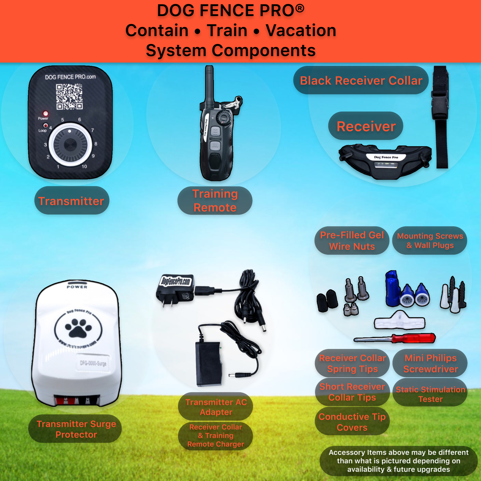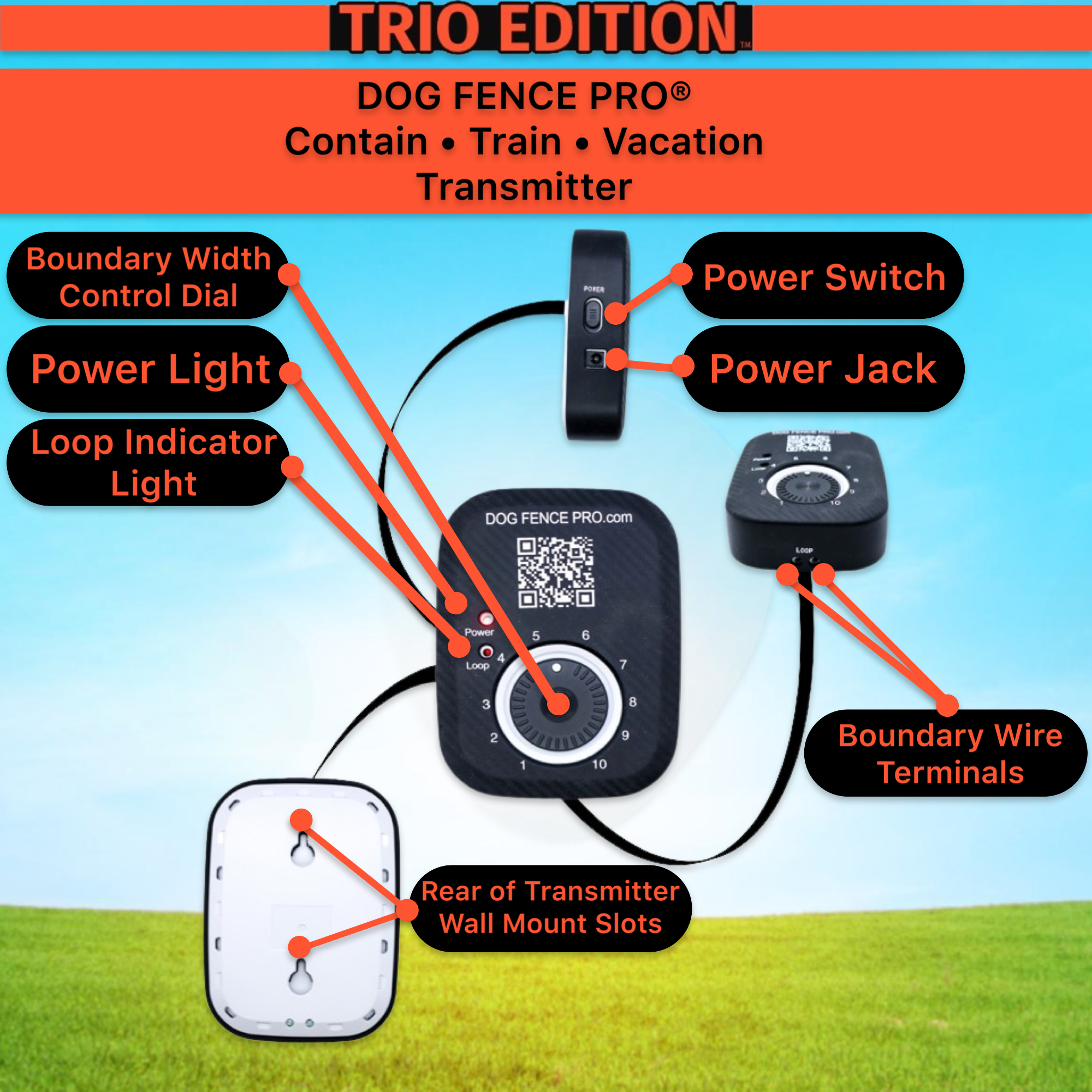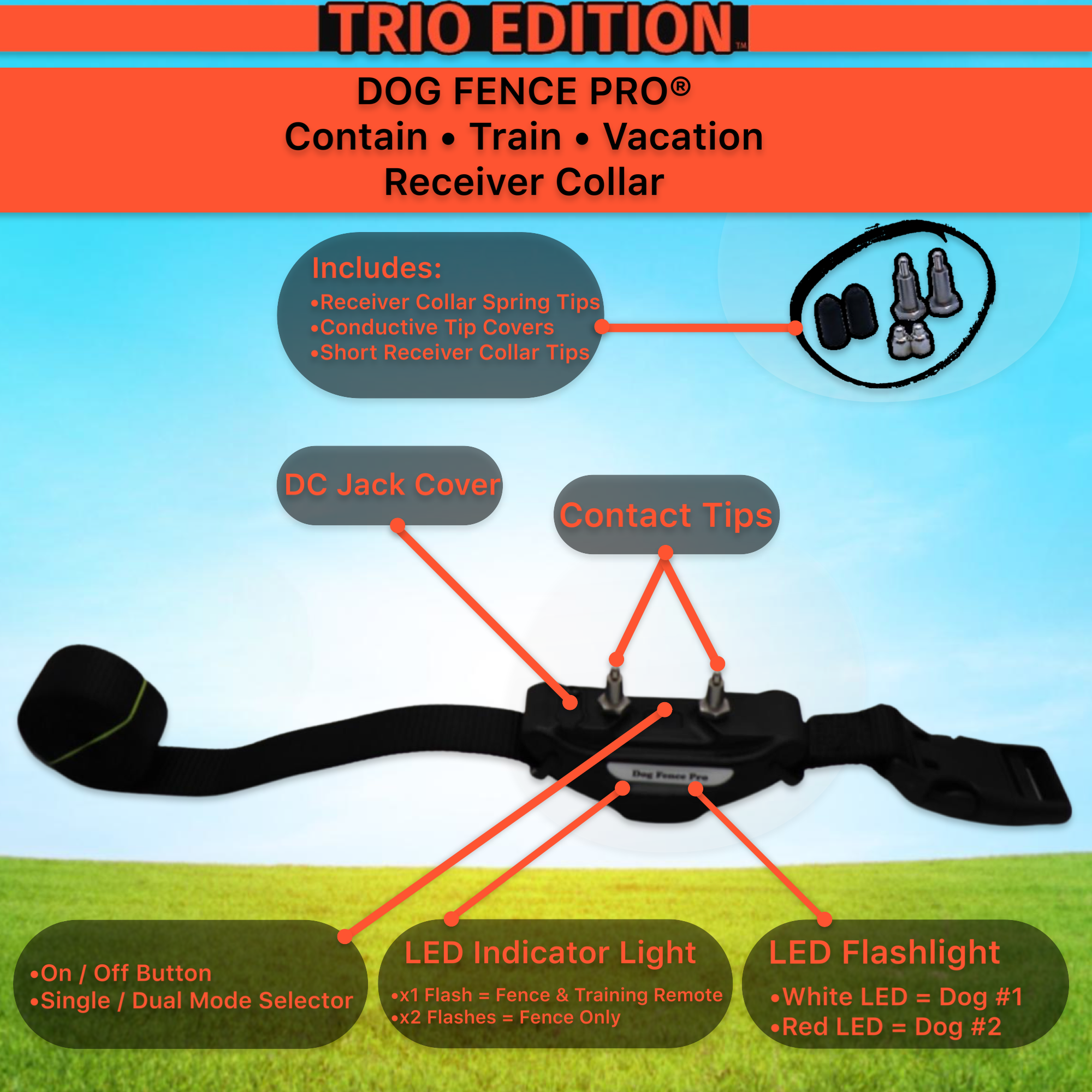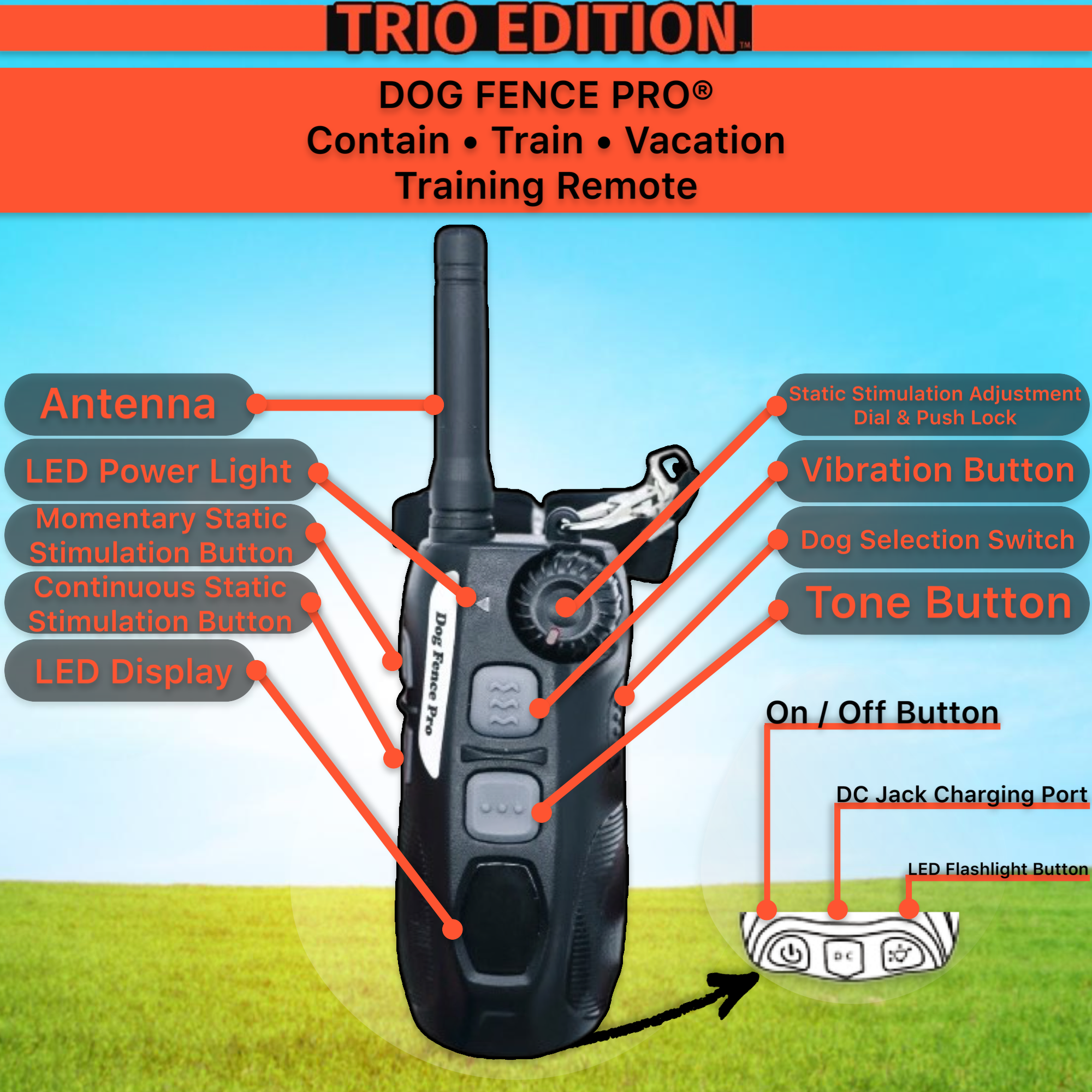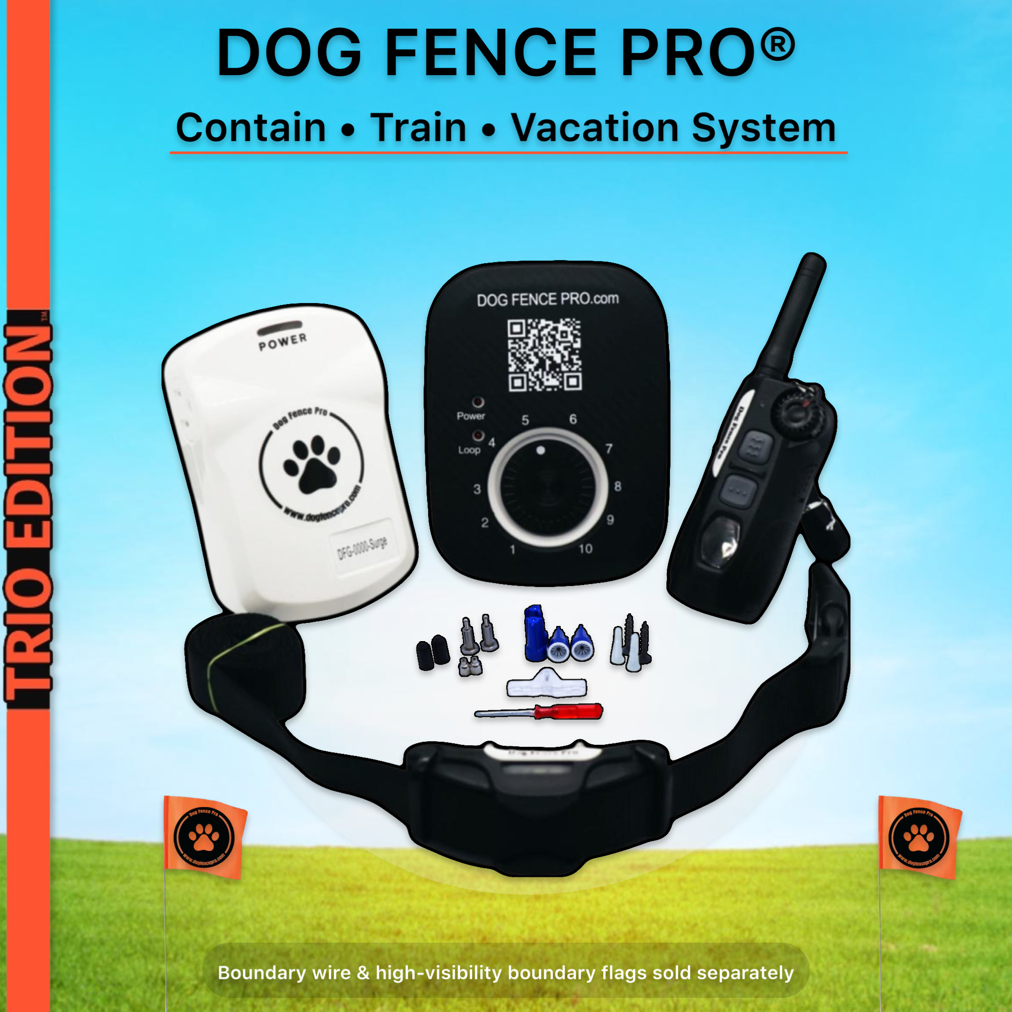 Introducing our latest innovation, the "TRIO EDITION". The Contain, Train, Vacation System by DOG FENCE PRO®. This one-of-a-kind, 3-in-1 System combines the following features all while using a single receiver collar: